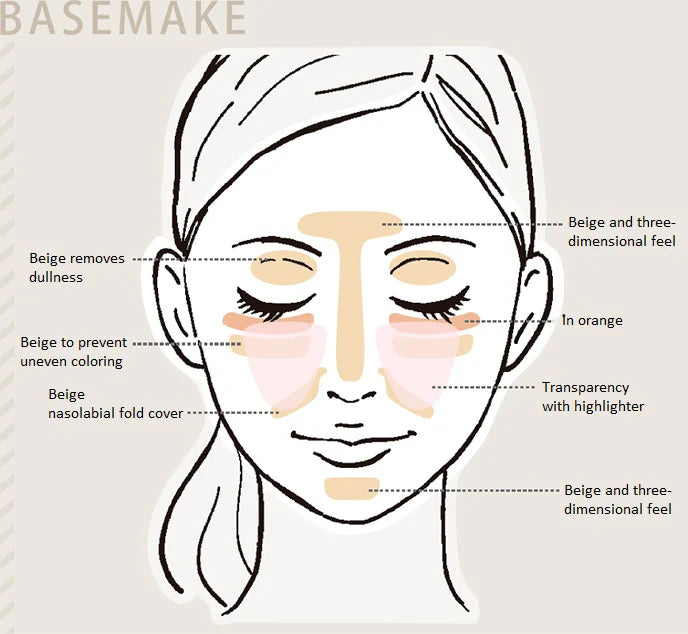 - 基本應用範圍:適用於從眼下到笑紋的三角區域。按照臉型,較圓形的,適合垂直地塗抹在臉頰上;臉型較長,適合以橫的方式塗於臉頰上;臉型偏小的,適合在臉頰上較廣泛範圍塗上光影粉。